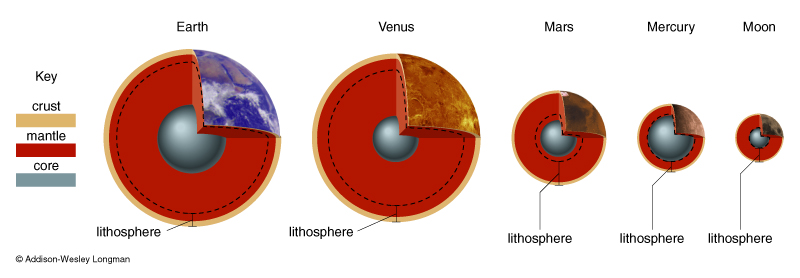 Though we do not currently have the means to see directly inside the Earth (or any other planet), we can use clues to make inferences about what may be lying beneath their surfaces. On Earth and the Moon, our most helpful data stems from the analysis of seismic waves, or vibrations that travel along the world’s surface and through its interior after earthquakes. For other terrestrial worlds, we can use other measurements like average density and gravity to determine the distribution of mass in the world’s interior. In this blog post, I will be discussing the three major layers that are present inside the terrestrial worlds: the core, the mantle, and the crust.